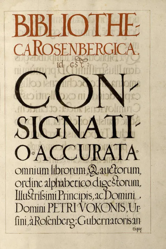 The catalogue was compiled under the supervision of the librarian Václav Březan at the Rosenberg court in Třeboň. It is divided into four parts and records approximately 10,000 manuscripts and printed books. It constitutes a unique source for reconstructing the form and scope of the Rosenberg Library at the time of the death of Petr Vok of Rosenberg (1612).